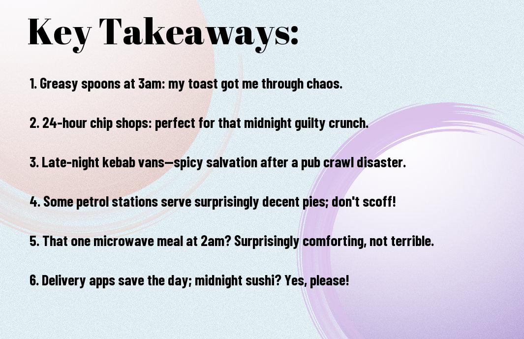 Conclusively, when those late-night cravings strike, I’ve found solace in my trusty local curry house and the ever-reliable 24-hour burger joint. Picture me, clad in my pyjamas, devouring a spicy tikka with one hand while scrolling through my social feed with the other—not my proudest moment, but certainly one of my tastiest! And I can’t forget that time I cheekily ordered breakfast pancakes at 3 AM, only for the delivery guy to ask if I was preparing for a midnight feast! So, whether it’s a cheeky kebab or a comforting bowl of ramen, the options are endless and delightfully satisfying!