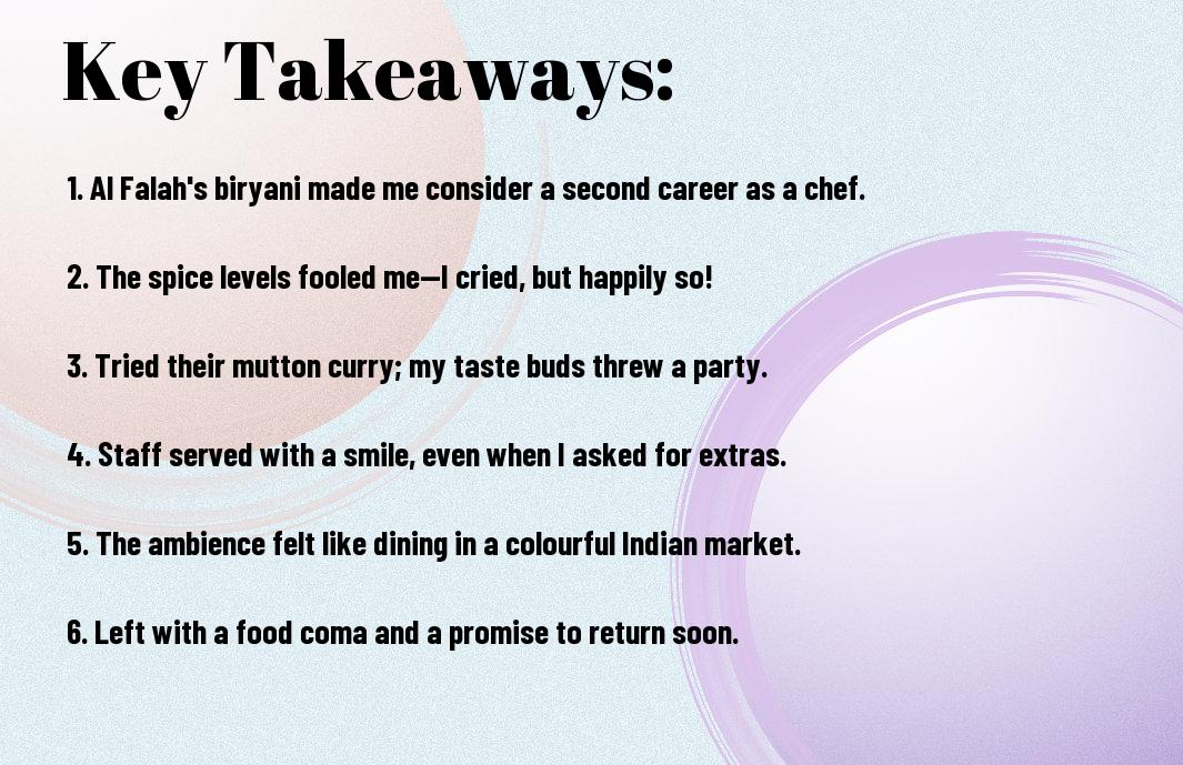 Delightfully, these conversations surprisingly forged connections between diners. I recall a somewhat animated chat with a group of locals who were adamantly defending their favourite curry. Somehow, you become part of a culinary community, joined by the quest for a brilliant meal and the odd scandalous food pun. I even chimed in about the time I mistook cardamom for cinnamon (don’t ask). It’s these unexpected moments amidst the delicious chaos that made Al Falah a dining experience to remember!
