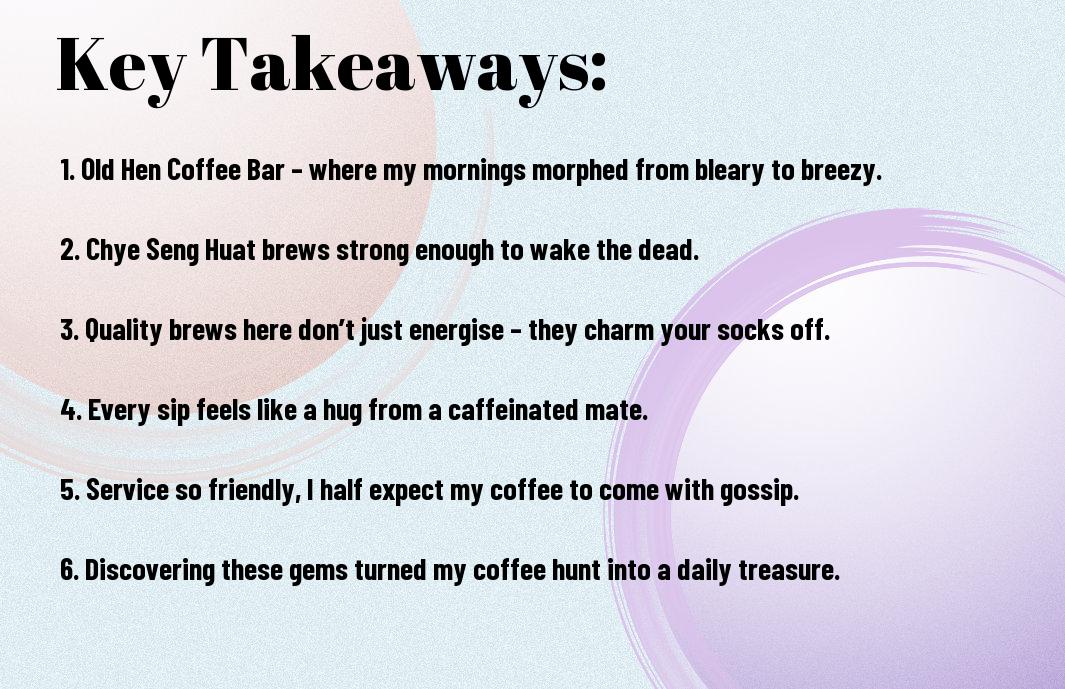 Overall, my caffeine adventures in Singapore have been a delightful blend of flavours and laughter. Old Hen Coffee Bar’s impeccable brews left me feeling euphoric, while Chye Seng Huat’s laid-back vibe kept my spirits high—perfect for those days when I forgot how to be an adult. I still chuckle at the time I mistook an espresso for a shot of liquid sunshine and nearly did a happy dance in public! If you’re on a quest for a satisfying cup, these spots will not only fill your mug but also your heart with joyous moments.