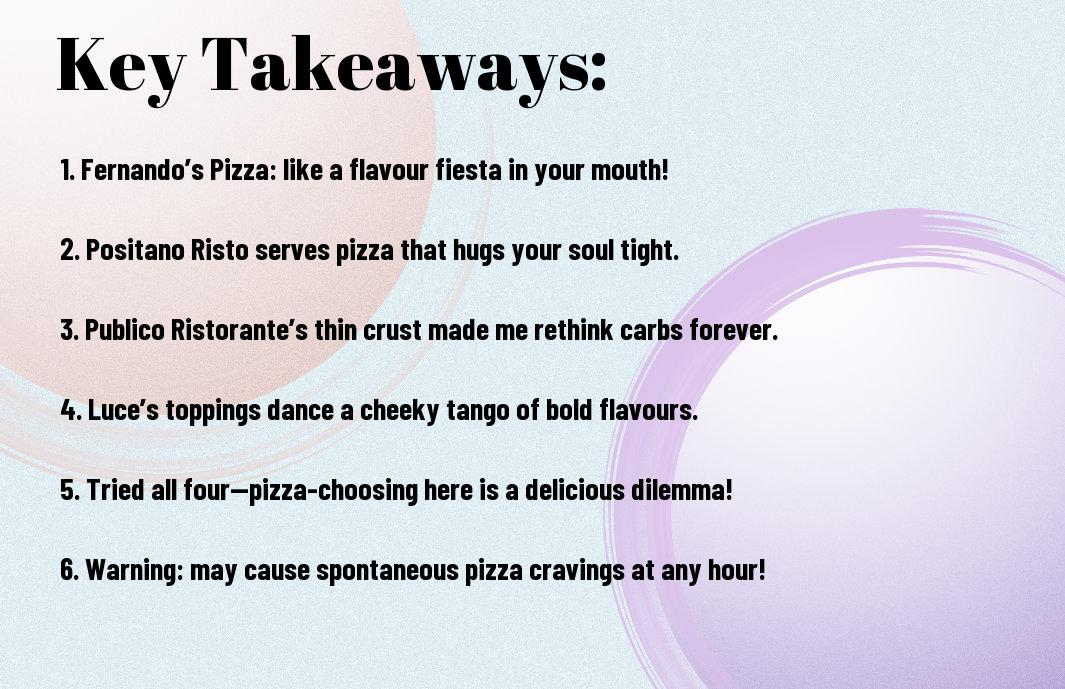 Your taste buds are in for a treat as I begin this epic pizza showdown! I had my own little pizza party, where I savoured heavenly slices from Fernando’s Pizza, Positano Risto, Publico Ristorante, and Luce. Each pizza brought its flair; Fernando’s was like a warm hug, while Positano Risto had a bit of a spicy kick, almost like it was trying to flirt with my palate! Publico was a classic crowd-pleaser, while Luce was a saucy contender that kept me guessing. Well, let’s just say it was a saucy contender that kept me guessing. It was a mouthwatering, hilarious slice of fun!