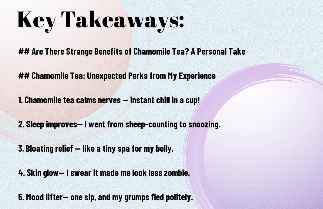 You may think of chamomile tea as just another herbal drink for soothing your spirit, but I’ve discovered some rather strange benefits that took me by surprise. One evening, while cradling my cup like a long-lost friend, I found myself not only calmer but also slightly more insightful, if I do say so myself. Suddenly, my random thoughts became less chaotic and more akin to an episode of a quirky sitcom. You may find it amusing, but I assure you that chamomile infused an unexpected sense of joy into my otherwise ordinary evening routine!