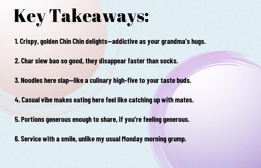 Understanding my limits at Chin Chin is like trying to understand quantum physics—nearly impossible! I recall one evening when I savoured dishes like roast duck and laksa, thinking I was invincible. However, while my friends laughed at my ‘food baby’, I clutched my stomach in agony and swore to never let my enthusiasm cloud my judgement again. Spoiler alert: I didn’t learn my lesson; I’m still the first to order dessert, every single time!