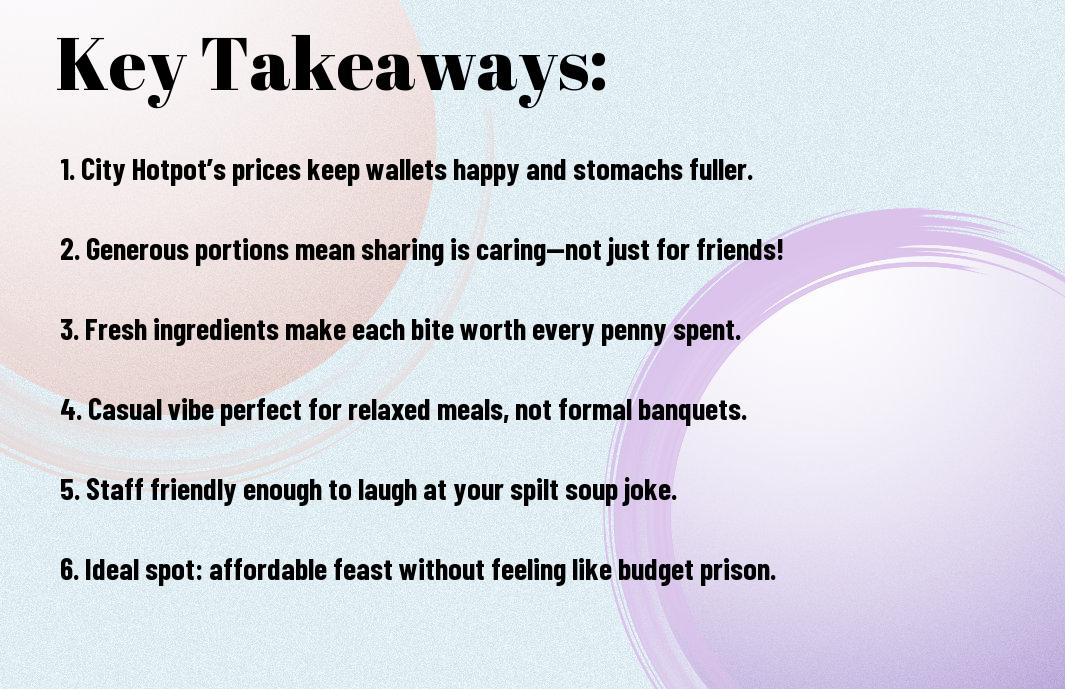 After some delicious calculations, the overall expense for my City Hotpot experience was a delightful surprise. I left feeling satisfied and heavier, but my wallet was not lighter. With generous helpings, I found myself wrestling with the idea of whether it was a steal or just a good deal. Honestly, I’d chalk it up as a worthwhile indulgence, not just temporary guilt!