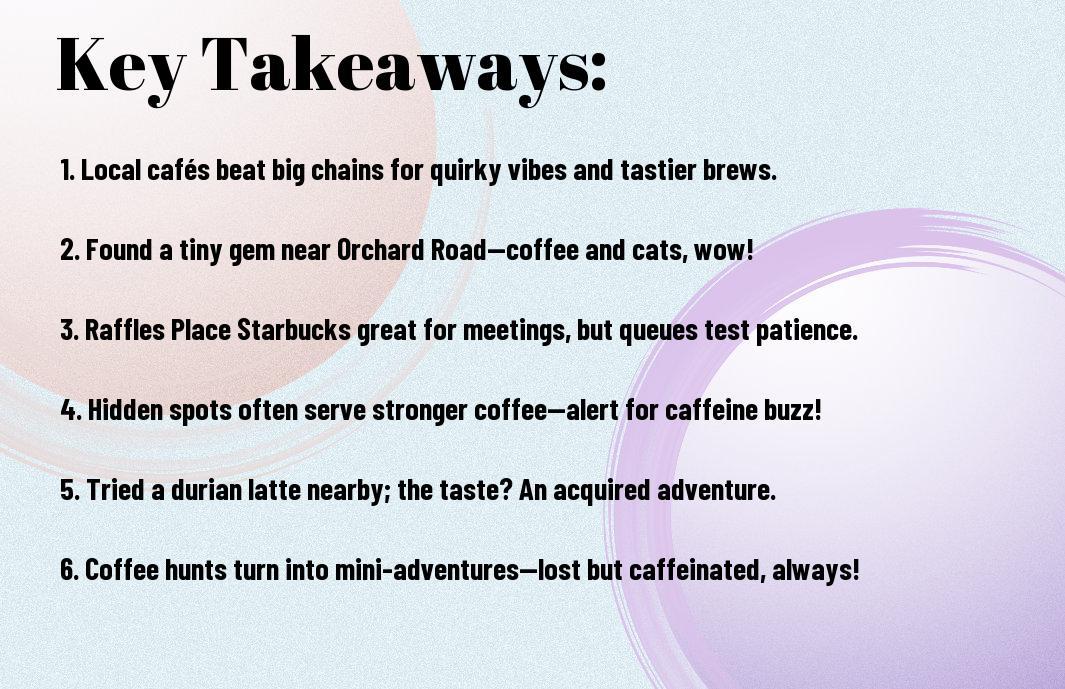 To wrap up, exploring coffee spots near me has been quite the adventure! My first sip of kopi-o at a hidden café in Tiong Bahru, which felt like a warm hug on a rainy day, is a fond memory. Let’s not even discuss the moment when I mistaken a herbal tea for a high-end coffee, causing my taste buds to become extremely confused! Whether it’s the comforting familiarity of Starbucks at Orchard Road or Raffles Place, or those quirky little gems tucked away, each cup tells a story. So, gear up and go on your coffee quest – who knows what you’ll discover!