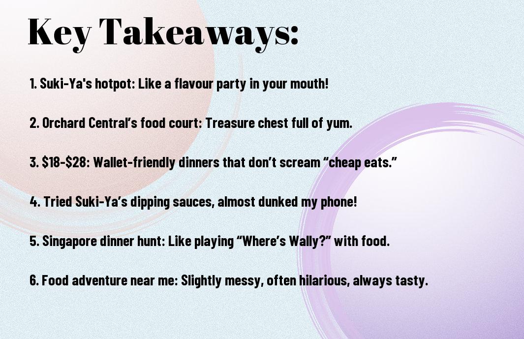 A: One of my all-time favourites happens to be Suki-Ya at Orchard Central. Imagine this: a steaming hot pot bubbling away, with a mountain of fresh ingredients waiting to be dipped in the luscious broth. The last time I visited, I made a delightful mess, resembling an octopus attempting to balance! But the result was a symphony of flavours—so who cares about being tidy? Plus, at around $25, you can indulge in all-you-can-eat glory, which is always a win. Just make sure your stretchy pants are at the ready!