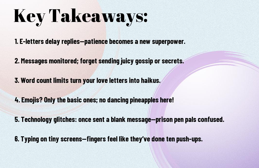 Considering these factors, I’ve discovered that writing e-letters in prison can present a variety of challenges. The thrill of getting a reply is akin to a surprise birthday party, but with the occasional hiccup—like when I sent my mate a hilarious joke about prison food, only for it to get flagged. I mean, who knew that “the only thing worse than the cabbage is the escape plan” could cause a stir? Still, it’s a vital lifeline, even if sometimes we both get more laughter out of the absurdities than actual messages. At least I don’t have to deal with paper cuts, and it keeps me entertained all around!