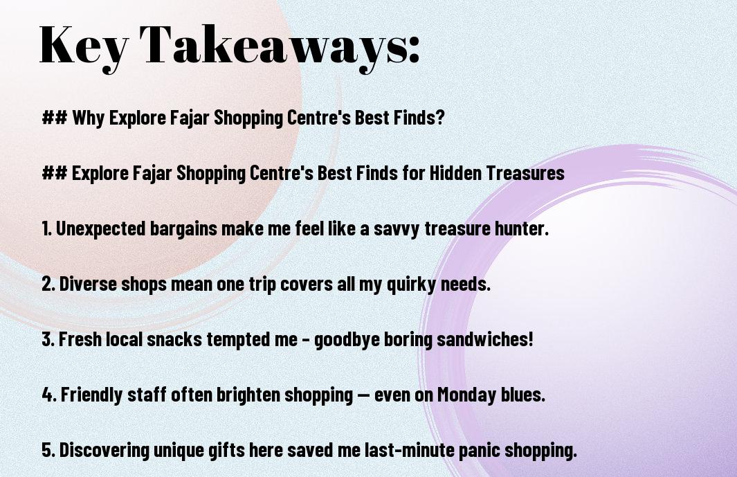 Upon reflecting on my adventures at Fajar Shopping Centre, I must say, it’s like a treasure hunt where I occasionally trip over my own enthusiasm! From discovering the best local foods that turned my lunch into a mini banquet to those delightful knick-knacks I never knew I needed (who thought a unicorn-shaped mug would be so crucial?), Fajar never fails to surprise. Each visit is a whirlwind of excitement and laughter, whether I’m haggling over prices or spotting new trends. So, if you haven’t explored Fajar’s best finds yet, you’re missing out on a delightful escapade!