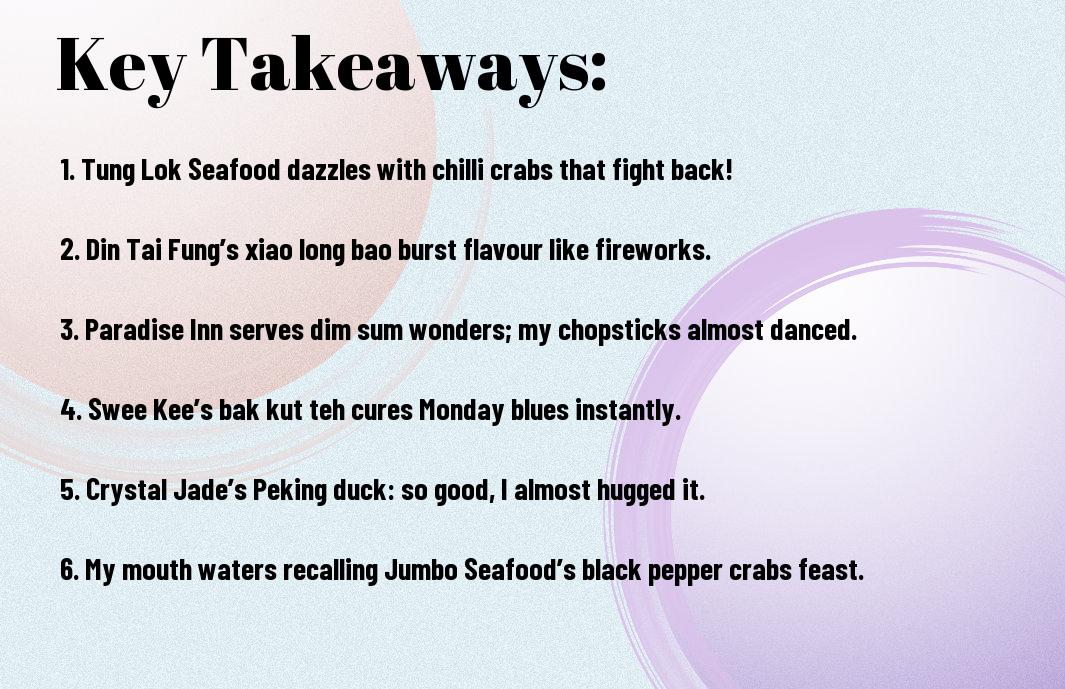 There’s nothing quite like a delicious Chinese meal to lift your spirits, especially amidst the hustle and bustle of Singapore! I’ve experienced a variety of delicious Chinese meals, including some regrettable choices that resulted in awkward dinner conversations, but let’s concentrate on the exceptional ones. From the mouth-watering chilli crab at Tung Lok Seafood to dim sum that could make a grown man weep, I’m here to share my top ten delightful experiences. So grab your chopsticks, and let’s investigate this culinary adventure together—just don’t blame me if you suddenly crave wontons!