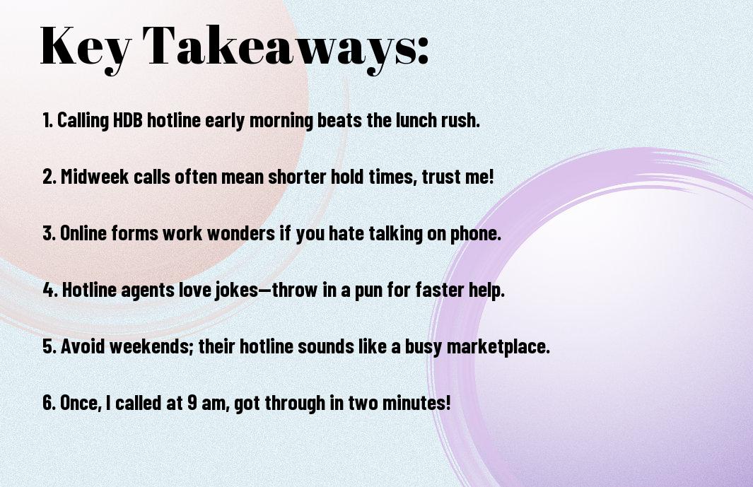 Upon reflecting on my experiences with the HDB hotline, I must say that calling during lunch hours is like trying to get through to a celebrity’s agent – good luck! I once waited so long that I had enough time to make a cuppa and nearly binge-watch an episode of my favourite series. The best time, in my opinion, is early morning when the lines are fresh and it’s just you and the very friendly voice on the other end. So grab your phone and don’t be shy; after all, everyone loves a friendly chat, especially about public housing!