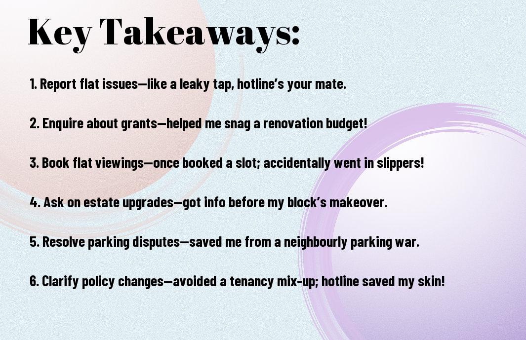- Do you need advice on upgrading your flat or understanding your lease agreements? The hotline is akin to having a knowledgeable friend who never runs out of patience. I remember calling about upgrading my kitchen, and they unleashed a flood of information—my head spun faster than a washing machine on a spin cycle!