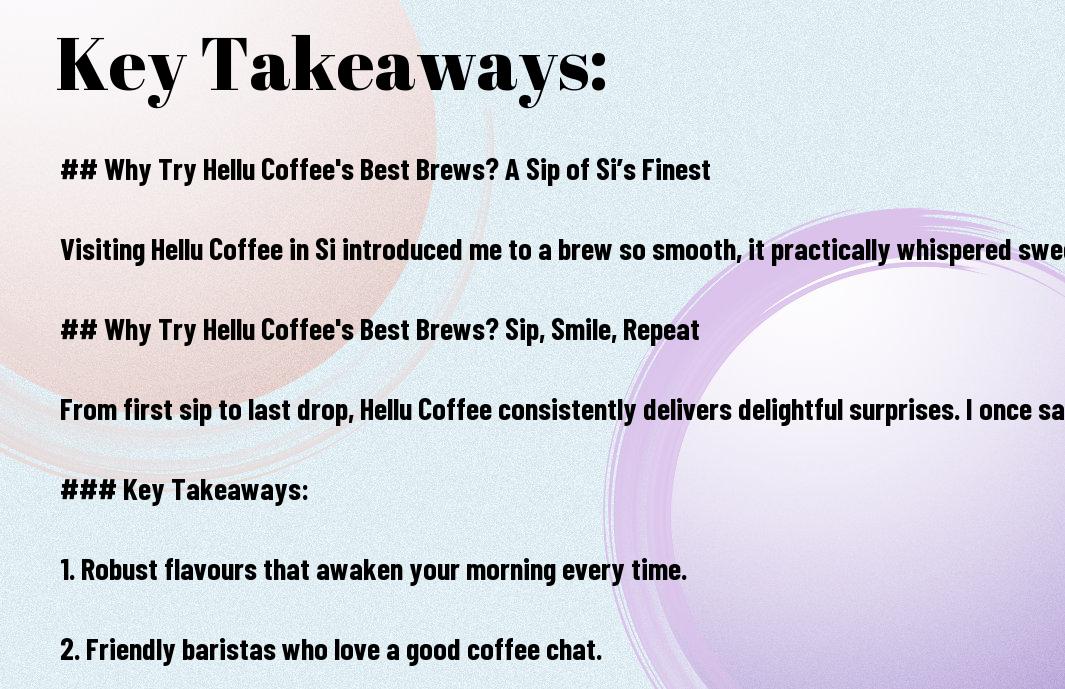 The allure of Hellu Coffee’s best brews can be a game-changer for any coffee lover. Every visit feels like a delightful adventure, with their selections offering an exciting twist on the usual fare. I once strolled into Hellu Coffee, curiosity piqued, and found myself utterly absorbed in the enticing aroma wafting through the air. One sip of their caramel sea salt latte, and I swear I could hear angels singing. If you’re looking for a taste of something special, trust me—you won’t want to miss out.