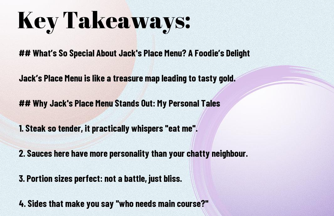 There’s something wonderfully unique about Jack’s Place Menu that keeps me coming back for more. From the moment I took my first bite of their signature Jack’s Burger, I knew I was in for a treat that put even my homemade attempts to shame—let’s just say my burgers never quite look like that! With cheeky menu items and generous portions that could almost feed a small village, I find myself giggling and grimacing every time I try to finish my plate. Join me as I examine the delightful quirks of their menu that make it truly special!