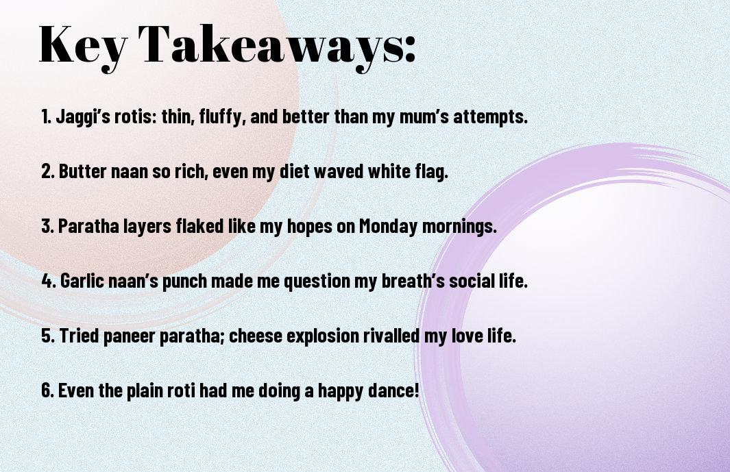 A: Ah, the tale of Jaggi’s rotis! Picture this: I stroll into Jaggi’s, expecting just another ordinary meal, but what greets me is nothing short of a roti revelation! Their rotis are like fluffy little clouds that decided to take a plunge into the ocean of deliciousness. My first encounter was with the butter naan—a buttery delight that had me questioning my life choices. Did I really need to eat five pieces? Of course I did! There’s something about the combination of crispy edges and the tender centre that had me head over heels. It’s as if the roti and I were meant to be. If only I could take one home like a loyal pet!