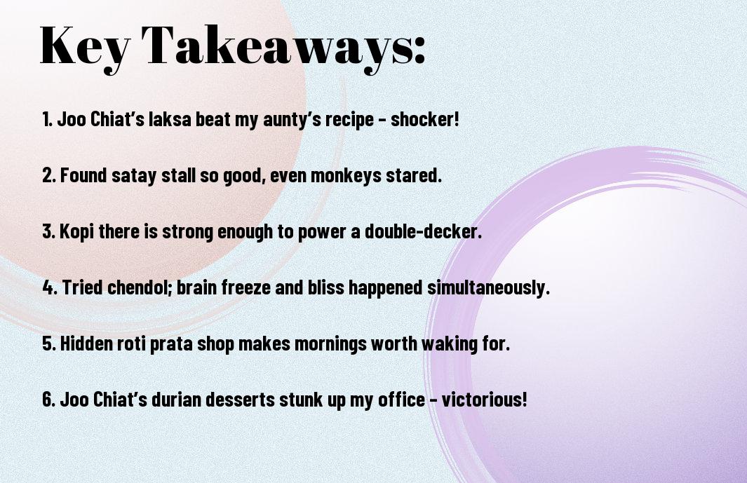 As I meander through the vibrant lanes of Joo Chiat, I am greeted by an array of mouthwatering aromas wafting from stalls like wafts from a witch’s cauldron—only far more appetising! Street food here is a delightful fiesta for the senses, where you can indulge in everything from fragrant satay to delectable roti john, all at prices that won’t leave your wallet wincing. Every bite tantalise my taste buds as I embrace the quirky charm of eating on the go; it’s a joyous experience that truly encapsulates the spirit of Joo Chiat.