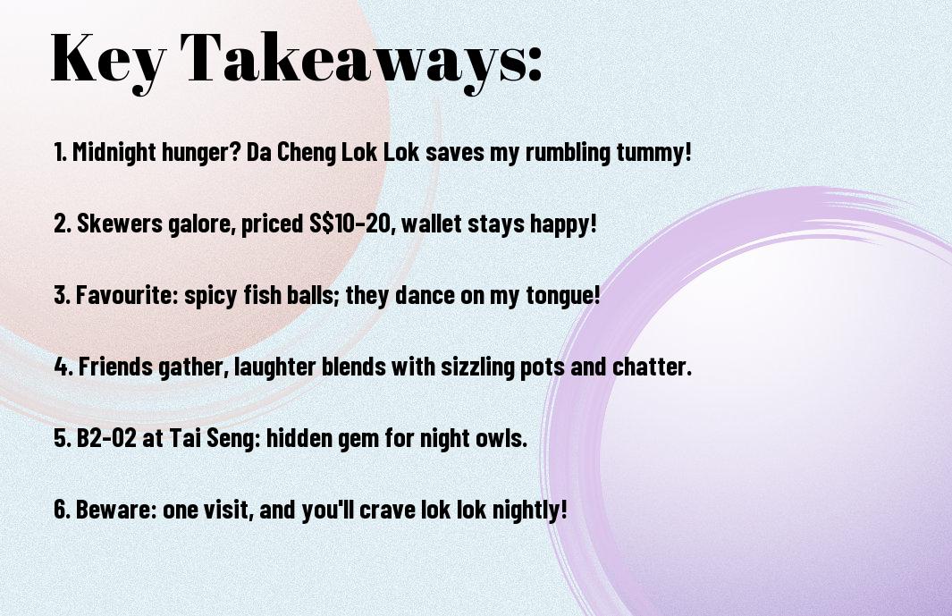 Over the years, I’ve begun many late-night food adventures, but nothing quite compares to my delightful escapades at Da Cheng Lok Lok in Tai Seng. Imagine this: me, a skewered snack enthusiast, surrounded by bubbling broth and friends questioning my life decisions as I attempt to balance 10 sticks of lok lok on one plate—it’s a sight to behold! Every bite, from spicy meatballs to cheeky vegetables, is a rollercoaster of flavours, accompanied by my questionable choices of toppings. Join me as I explore the top 10 magical moments I’ve had indulging in late-night lok lok bliss!