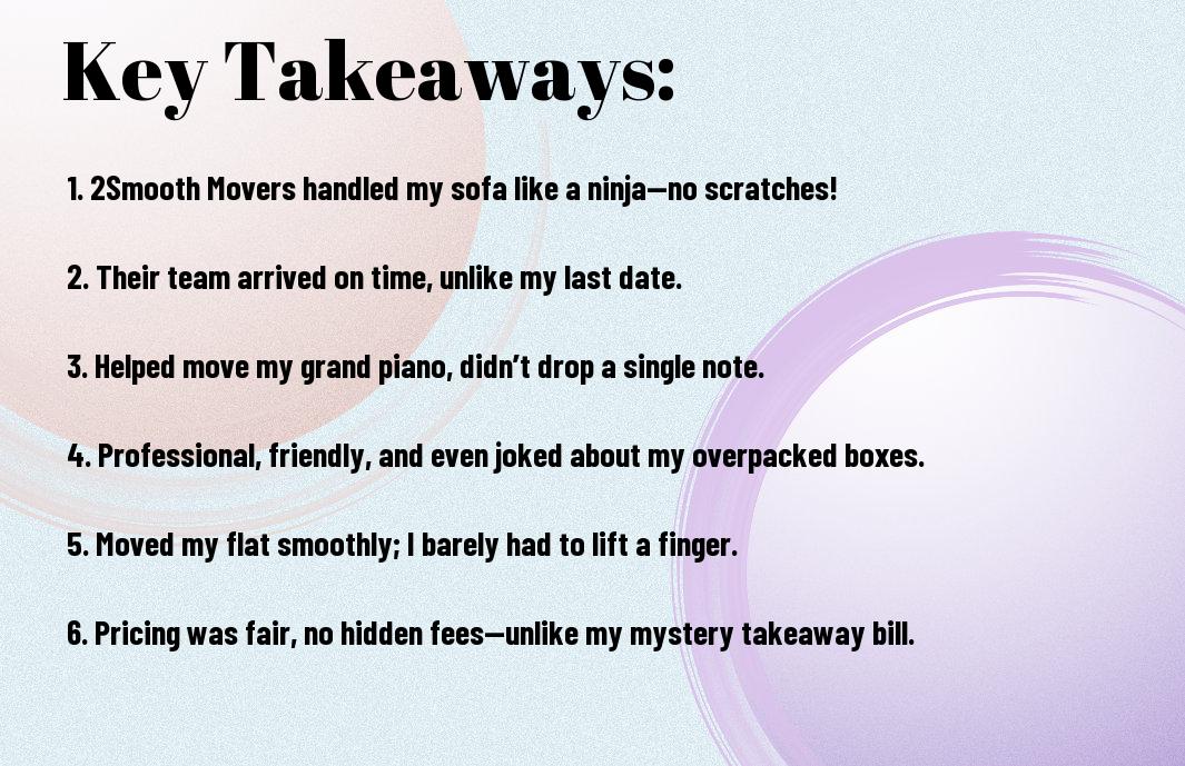 All in all, my experience with 2Smooth Movers was a delightful surprise wrapped in bubble wrap. From the outset, they handled my moving chaos with the finesse of seasoned circus performers juggling flaming swords—while I attempted to locate my left shoe, of course. Their customer service was not only efficient but also brimming with personality, making me chuckle between the rolls of packing tape!