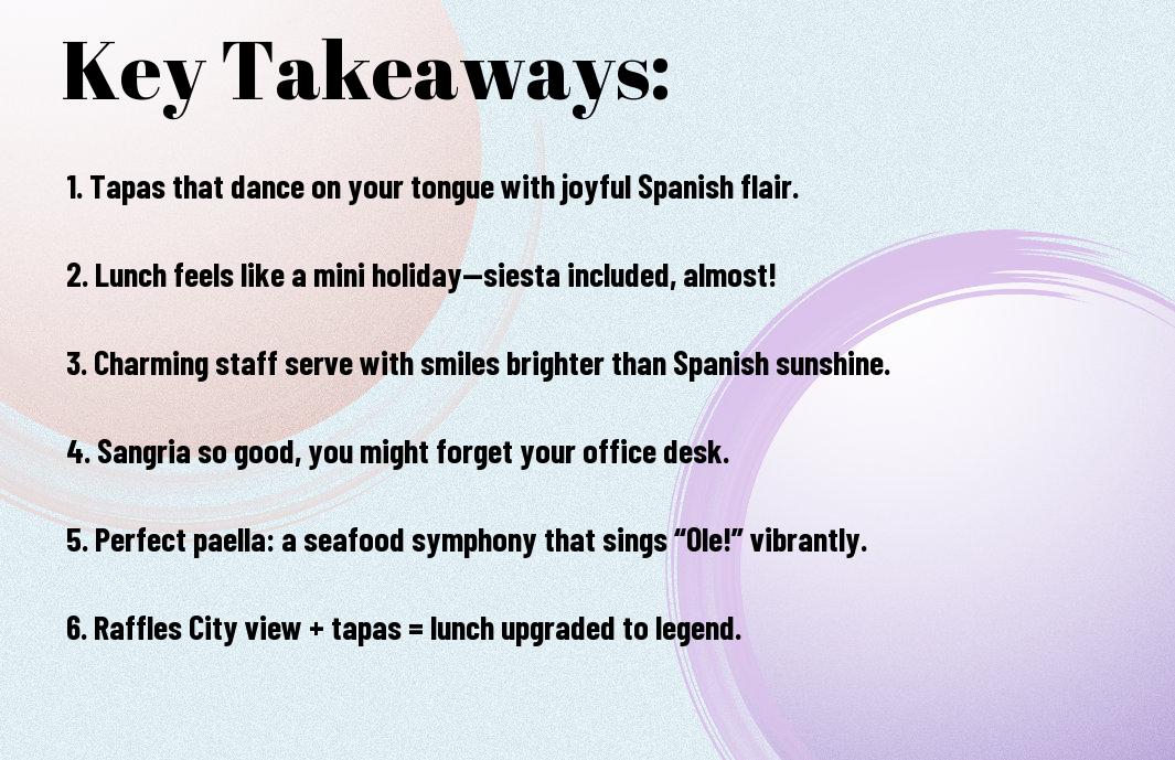 MoVida Singapore offers a unique Spanish siesta that you may not have anticipated. Picture this: vibrant tapas dancing on your taste buds while you soak in the charming ambience. I’ll never forget my first bite of their patatas bravas – I nearly swooned like a bullfighter in a matador’s outfit. With flavours as bold as a fiesta, your lunch will be anything but ordinary – just try not to accidentally spew olive oil all over your colleague’s lap like I did! Trust me, it’s the perfect blend of stunning dishes and a dash of humour.