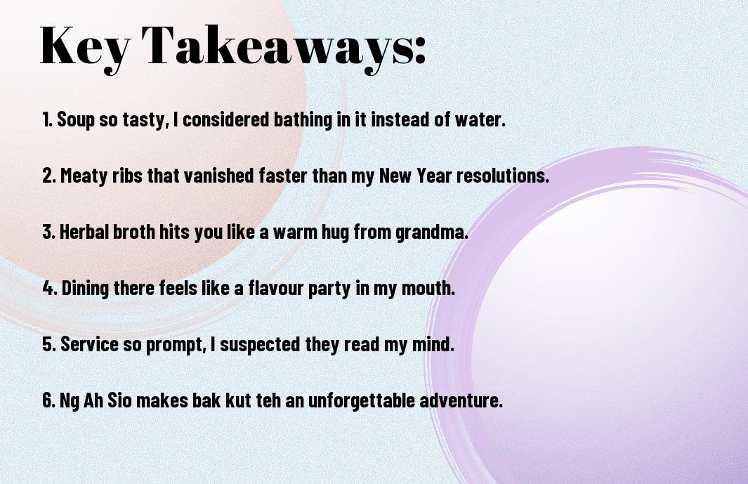 With a hunger for adventure and a mischief in my heart, I stumbled upon Ng Ah Sio Bak Kut Teh, a treasure trove of flavours! Picture this: it’s 2:00 PM, and I’m contemplating whether I should actually pay attention to my diet—then I caught a whiff of that rich, herbal broth. Ganache or gravy? I nearly serenaded the staff with my excitement! Join me as I recount my unforgettable experiences, from slurping up tender ribs that practically fell off the bone to dunking dough sticks in that ambrosial soup. Trust me, you won’t want to skip this culinary ride!