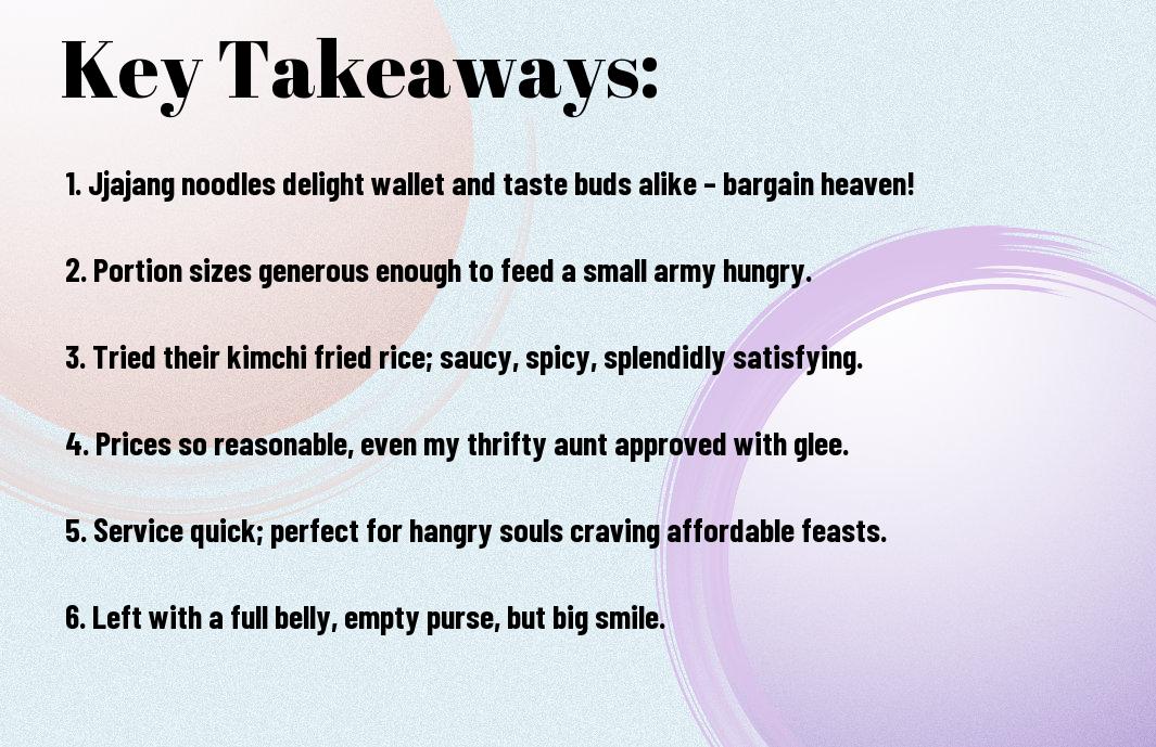 You might be wondering if O Bba Jjajang’s meals are actually affordable or if I just have a penchant for indulging in overly generous portions of Korean goodness. Well, let me tell you about my last visit, where I ordered a mountain of Jjajangmyeon that was big enough to feed a small army—thank goodness I’m a warrior when it comes to noodles! Spoiler alert: my wallet didn’t scream too loudly after the bill arrived, so let’s examine whether this beloved Korean eatery serves up budget-friendly delights or if I’ve merely been living in noodle utopia!