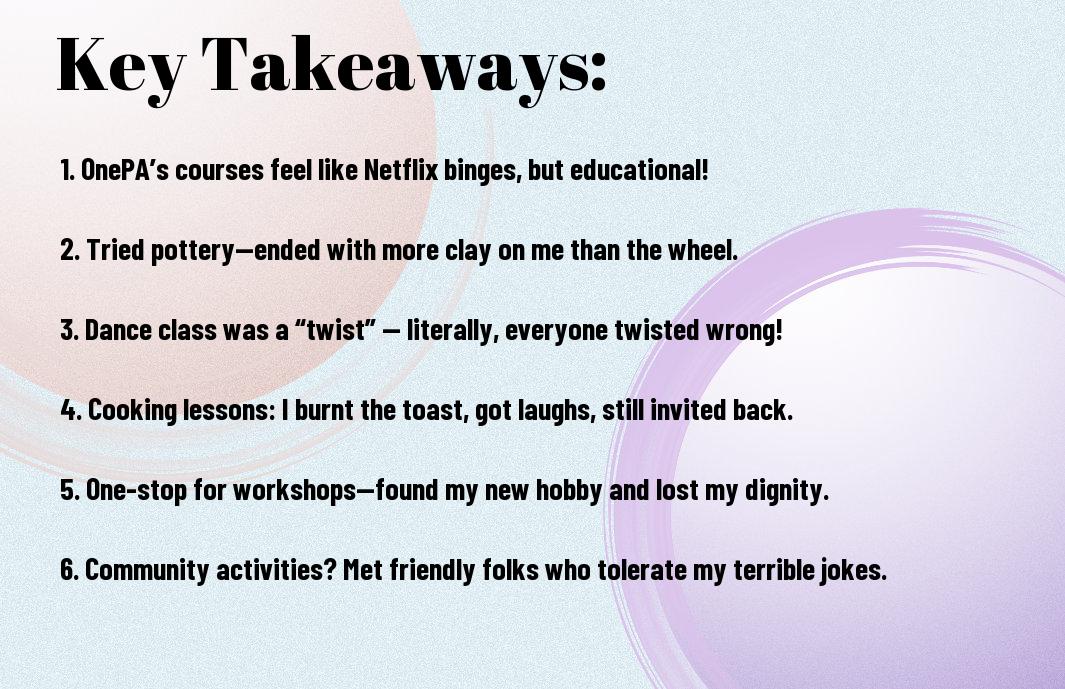 Summing up, my experience with OnePA has been a delightful surprise! Picture this: I signed up for a pottery class, thinking I’d emerge as the next Picasso of ceramics, but instead, I created what looked like a lopsided dog bowl. Honestly, I think I should start a new trend in abstract art! The variety of courses and activities is astounding, and each session has brought unexpected laughs and skills to my life. So, if you fancy a good chuckle while learning something new, OnePA is definitely the place to be!