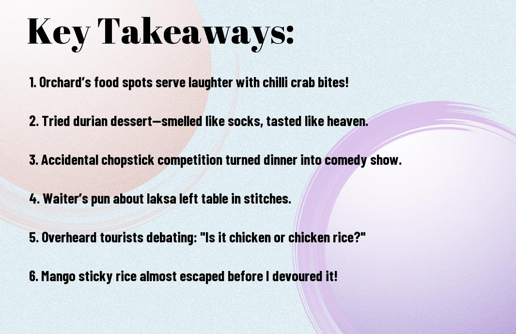 The laughter I’ve encountered while exploring the Orchard food scene is truly astounding! From accidentally ordering what I thought was a modest side of ‘sambal’ only to be greeted by a flaming plate of spicy devilry to mistaking a sushi roll for a dessert because it was presented so artfully. Every meal has been filled with a plethora of hilarious mishaps, including misinterpreted dishes and playful food interactions. Join me as I recount my most amusing culinary misadventures right in the heart of Singapore’s vibrant dining hub!