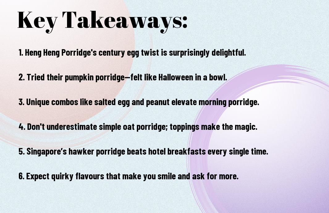 Considering all these points, I must say that my porridge adventures have been quite flavourful! At Heng Heng Porridge in Singapore, I dared to try their signature chicken porridge topped with a zesty twist of lime—who knew breakfast could be as exciting as a rollercoaster? I mean, one spoonful had me questioning why I ever settled for plain oats! So, if you’re up for a flavourful ride, grab your spoon and make your way to Heng Heng—your taste buds will thank you, and you might just leave with a grin that could rival a Cheshire cat!