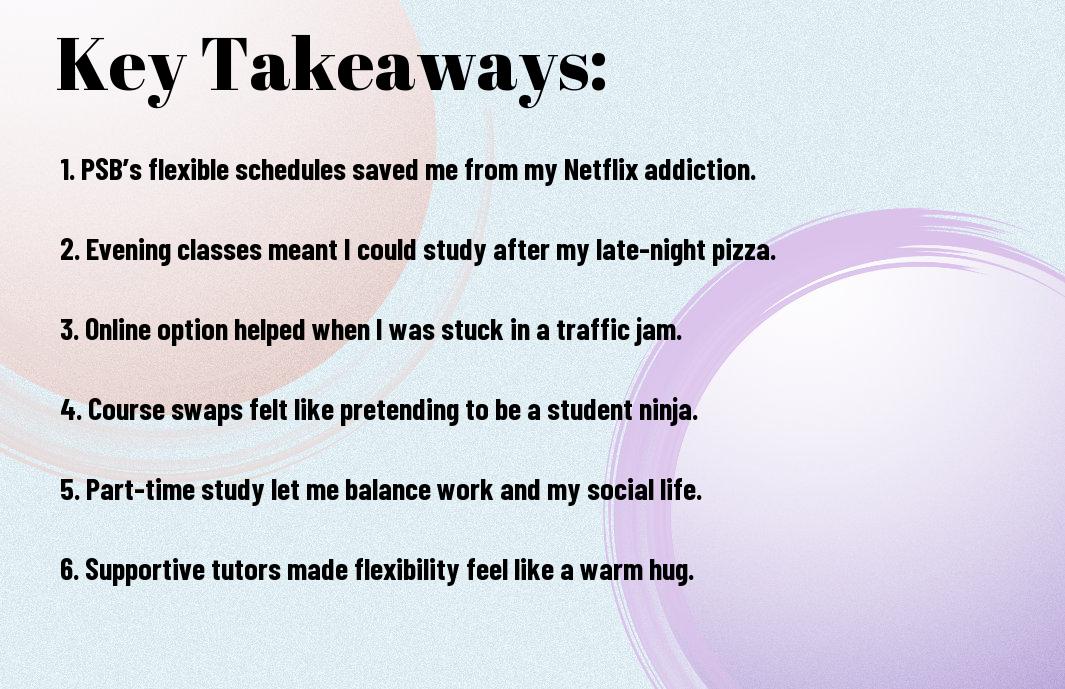 A: Ah, flexibility at PSB Academy is more than just a yoga position! They offer various study options that cater to different lifestyles and commitments. For instance, I’ve seen students juggling part-time jobs while effectively pursuing their degrees. They have options like full-time, part-time, and even online learning, which makes it feel like you can literally study anywhere—even while wearing your pyjamas! I’ve personally opted for part-time evening classes, which left my mornings free for important things in life, like sleeping and binge-watching my favourite series.