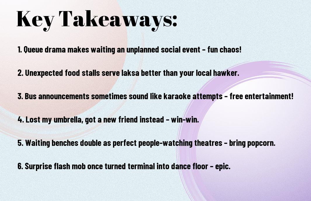 A: Get ready to indulge in the delicious options available around the terminal! While I was waiting for my bus, I stumbled upon a stall selling local delights. The curry puff was so good that one bite nearly brought me to tears of joy—seriously! I’d recommend trying a bowl of laksa or a hot, fluffy bao. However, be careful not to lose yourself in the culinary delight! I once went in for just a quick snack and somehow ended up ordering an entire feast that could have served a small village. My friends still joke about it—it was a food coma on wheels!