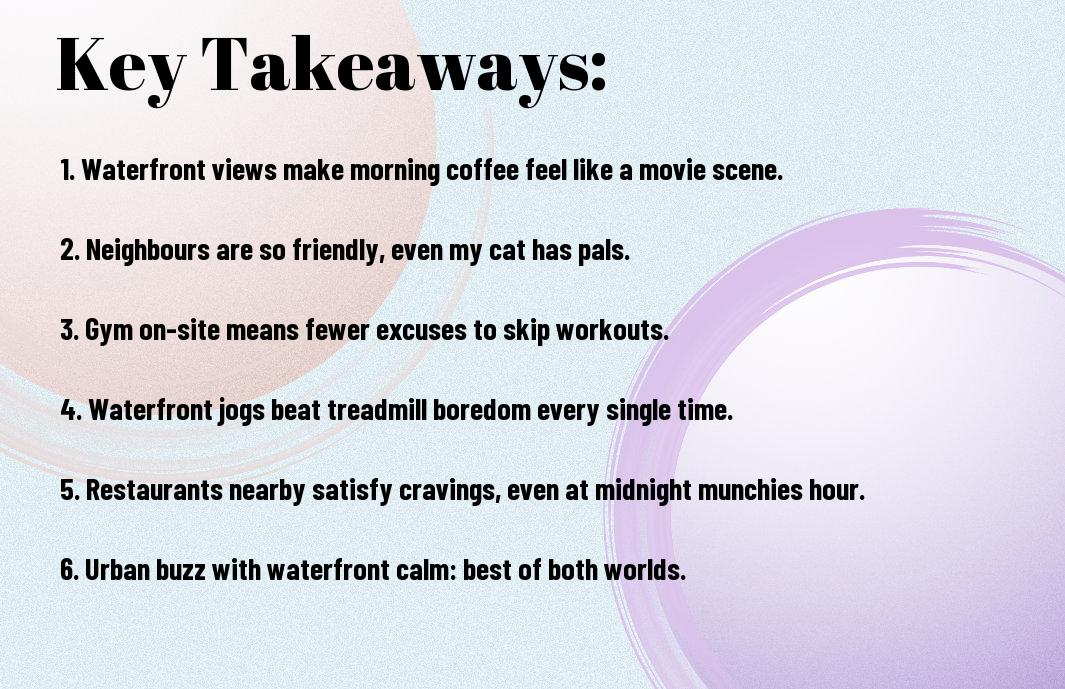 Any time I step inside my flat, I feel an overwhelming sense of comfort. The airy spaces and modern finishes ooze a warmth that makes it hard to leave. I once attempted to invite a friend over for a ‘chill evening’, but with the captivating views, we ended up sipping wine and gushing over the sunset instead! I suppose I should have prepared them for the emotional rollercoaster that is my waterfront home!