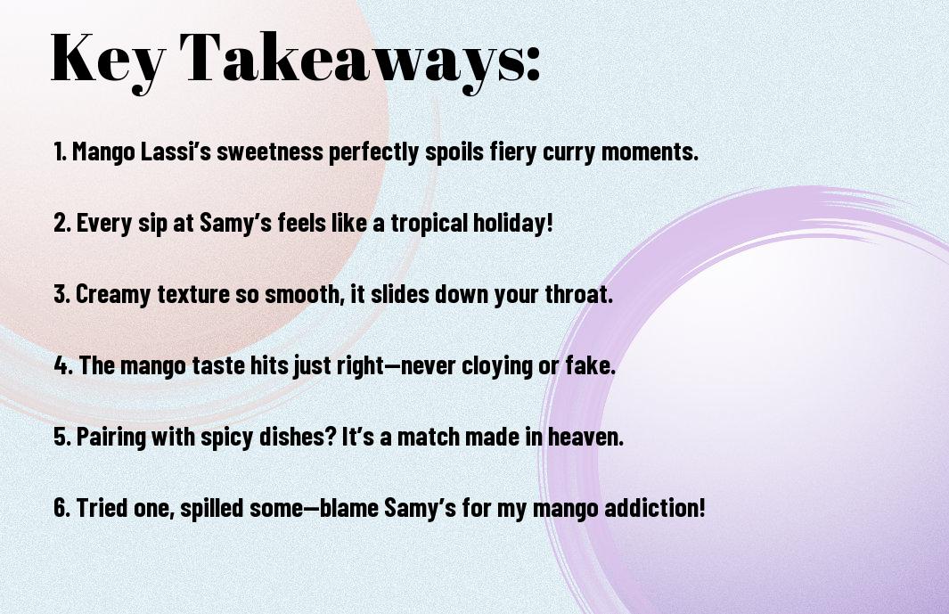 A: Pairing the mango lassi with the rich curries at Samy’s is like pairing a classic novel with a warm cup of tea—utterly delightful! The lassi cuts through the spiciness of the dishes beautifully. Once, I indulged in a fiery Chicken Vindaloo that left me sweating profusely and questioning my life choices. But then, I took a sip of the lassi, and it was like fire and ice brought harmony to the table! Let’s just say my taste buds had a party, and I was the raucous DJ.