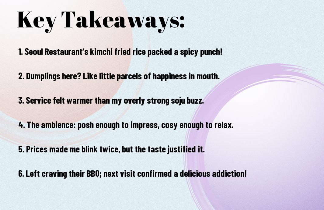 Regarding my experience at Seoul Restaurant, I found myself smirking at my bill more than once. It’s like a game of culinary roulette – could I score a sublime feast, or would I end up crying into my wallet? The prices lean towards the higher end, perfect for those special indulgences; however, it’s crucial to weigh the experience against the cost.