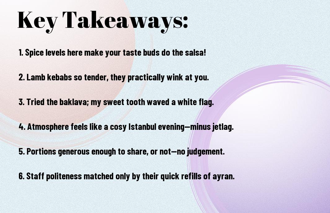 A: If you’re wearing your most daring culinary pants, then you simply must look into their ‘Iskender Kebab’. This dish is like a Turkish hug on a plate – layers of lamb, served over pita with melted butter drizzled on top. It’s heaven! The first bite hits you like a warm wave, and before you know it, you’re in a love affair that could rival any rom-com. Prepare yourself for a serious food coma afterwards! After indulging in this delight, I once lay on the sofa, skilfully avoiding any responsibilities, dreaming of my next visit. This meal inspires a positive reevaluation of your life choices.