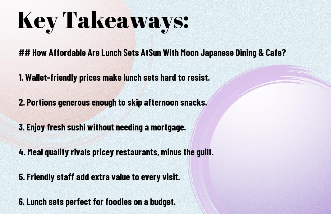 Considering all points, I’d say the lunch sets at Sun With Moon Japanese Dining & Cafe are truly a delightful surprise for your pocket and palate! On my recent visit, I savoured a sushi set that not only filled me up but also left me with change from a tenner—who knew dining could be so kind? The only downside? Trying to eat those elegantly rolled pieces without looking like a toddler on a spaghetti spree! So, if you fancy a lovely meal that won’t blow your budget, this spot is a must-try. Bon appétit!