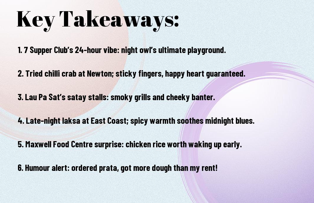 Ultimately, my late-night escapades at places like 7 Supper Club have transformed ordinary evenings into culinary adventures. I still chuckle thinking about my friend’s attempt to eat a whole plate of crispy prawn noodles while debating the existence of UFOs – let’s just say he ended up needing a second bowl of soup! These 24-hour gems in Singapore have satisfied my midnight cravings and created hilarious memories. If you’re searching for a place that serves up delicious food and hearty laughs, look no further than these extraordinary supper spots. You won’t regret it!
