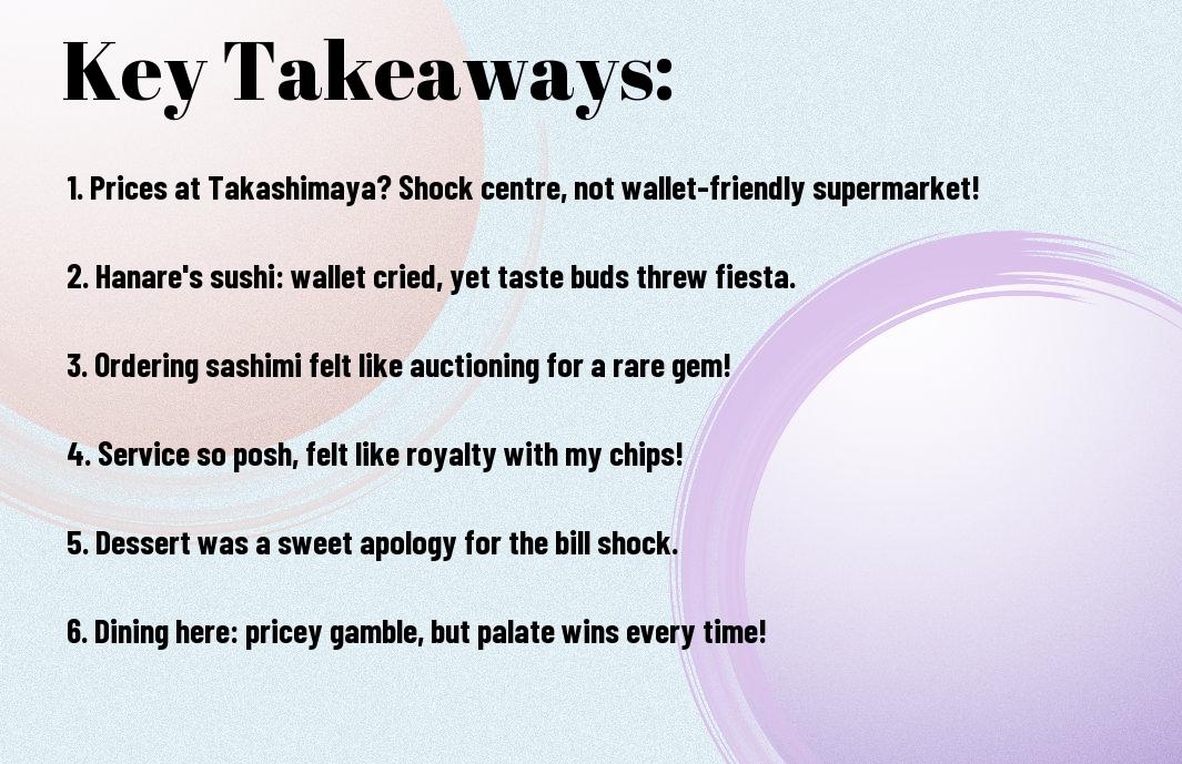 In the matter of deciphering the prices at Takashimaya’s Hanare by Takayama, it’s like peeling an onion – layers and layers of complexity, with perhaps a tear or two! In my experience, the prices reflect not just the food itself but the overall dining experience. The ambience, staff expertise, and the intricate presentation all add to that hefty bill at the end. Just remember, you’re paying for more than just the meal; it’s the whole shebang of foodie delight!