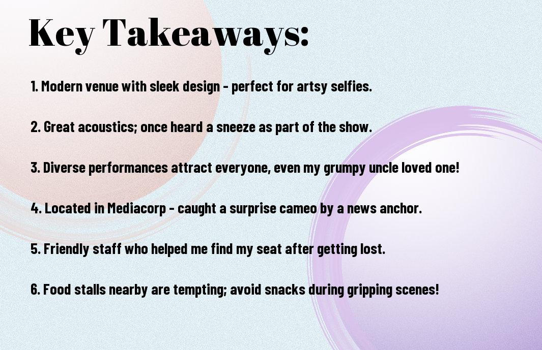 Nestled within the lively atmosphere of the Mediacorp grounds, the theatre proudly stands as a beacon of community spirit, bringing together people from all walks of life. I’ve found that its warm embrace really fosters local talent, allowing quirky productions and vibrant performances to shine. The theatre not only showcases established artists but also provides a platform for emerging voices, enabling our local culture to thrive in unexpected ways. Who knew I’d spend a Saturday night laughing at a clever local comedy show that started with just a handful of seats filled?