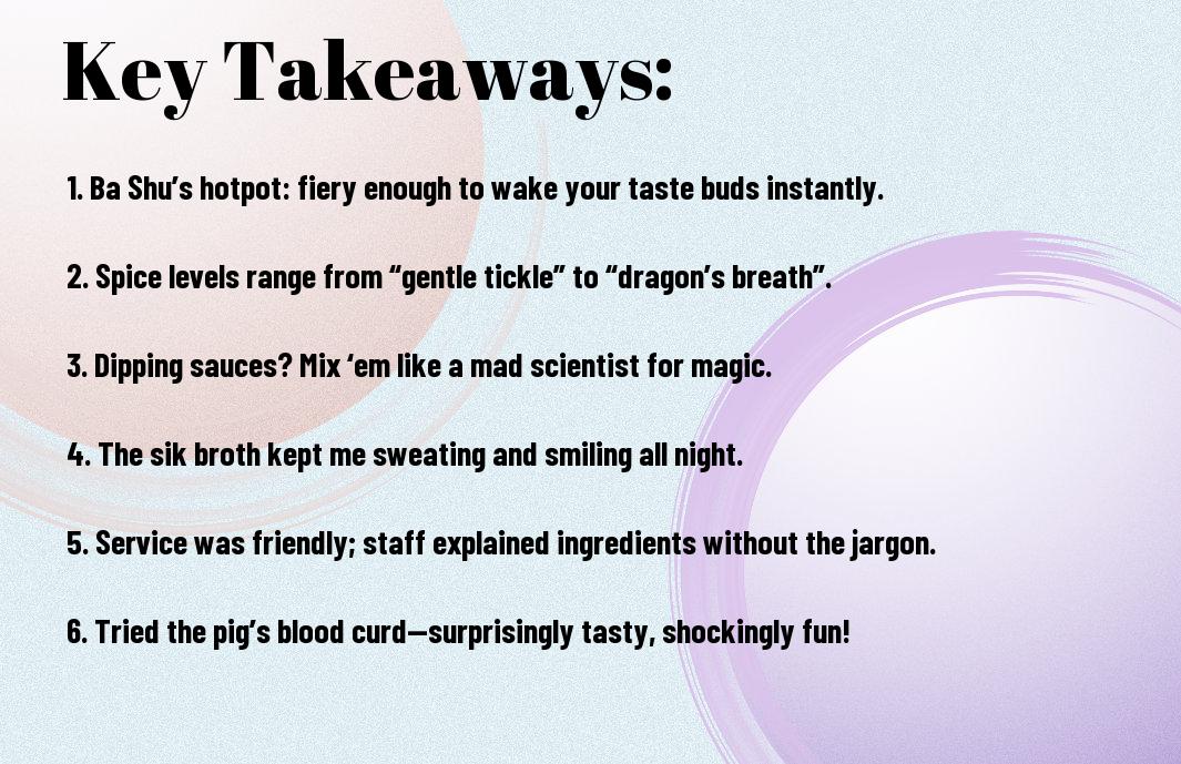 A: Indeed, the hotpot at Ba Shu Sichuan Restaurant resembles a harmonious blend of flavours! Each bite dances on your palate with unforgettable flavours. Picture this: a bubbling cauldron filled with a fiery red broth that whispers, “I dare you!” The spices perfectly harmonise, delivering a perfectly balanced, gut-warming heat. The array of fresh ingredients—from silken tofu that slides into the broth like a graceful swan to succulent lamb slices that practically beg you to savour their lusciousness—creates a delightful medley. I once attempted to keep it spicy, but I ended up looking like I’d just run a marathon due to the sheer heat! My friends dubbed me ‘Tomato Face’ for the rest of the evening. The experience was truly intense!