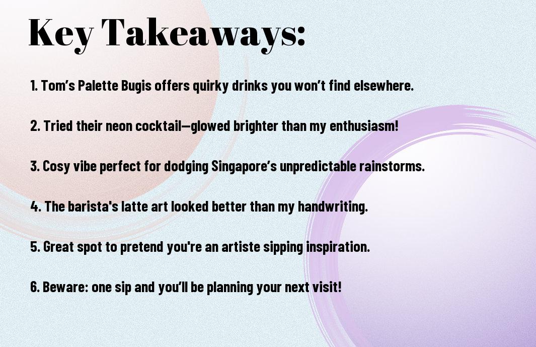 Summing up my visit to Tom’s Palette Bugis, I must say it was a delightful experience that tickled my taste buds and my funny bone. I still laugh when I recall the fruity drink named “Tropical Tantrum” that made me rethink my life choices after the first sip—I mean, who thought passion fruit and a hint of mint could create such chaos? The cosy atmosphere and charming staff only added to the charm, making it a must-visit spot, especially when you’re in the mood for something out of the ordinary. Cheers to that!