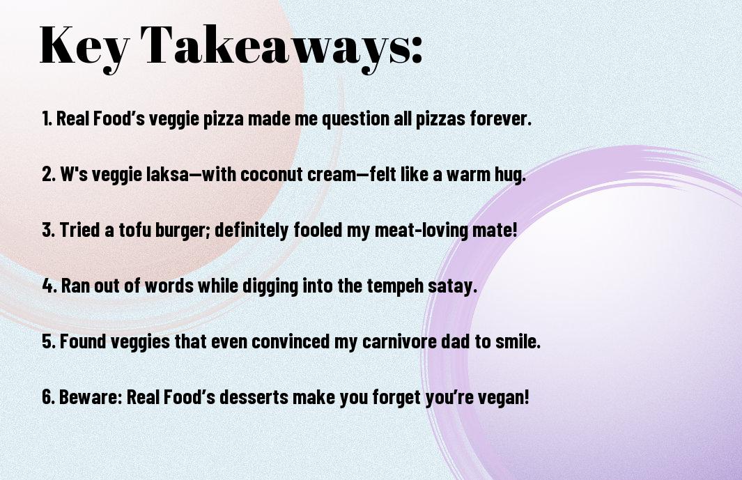 A: If you’re in Singapore and fancy some top-notch vegetarian fare, you simply must try Real Food – their dishes are fresh and packed with flavour. I once ordered the spicy mushroom burger, which was so delicious that it made me pause and appreciate my life choices! Another fantastic spot is W, where their buttermilk pancakes are so fluffy they could double as pillows. Trust me, if I could have a sleepover there, I would!