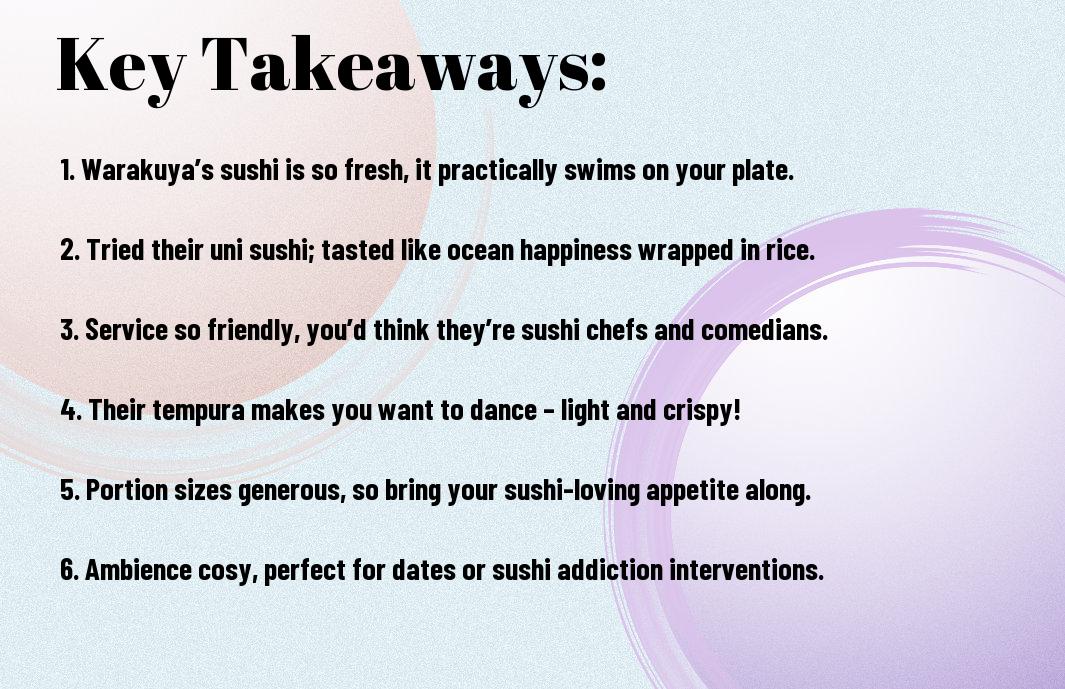 A: Oh, where do I start? If I had a dollar for every time a sushi roll made me swoon, I’d be a millionaire! The Warakuya Roll is a fan favourite—imagine a spicy tuna and avocado combo that practically does the cha-cha in your mouth! I once had this roll with a friend who claimed he hated sushi (what was he doing there?!). By dessert, he was considering a career in sushi eating! And let’s not forget the tempura—light, crispy, and so delicious you may question Earth’s existence while chowing down on it.